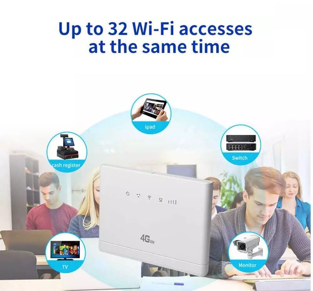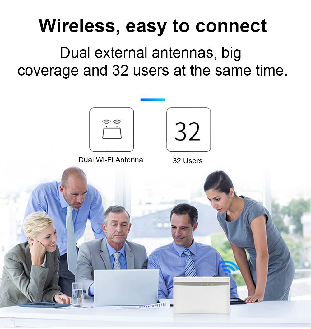 Jest to wysoce zaawansowany wewnętrzny router CPE LTE. Został zaprojektowany, aby sprostać potrzebom zintegrowanego dostępu do danych i Wi-Fi dla użytkowników indywidualnych, biznesowych i korporacyjnych. (możliwość podłączenia do zewnętrznych anten złącza SMA!) Wysoka prędkość 150M, LTE FDD: DL/UL 150M/ 50 Mbps (Cat 4). Przenieś 4G na Wi-Fi, Nie potrzebujesz szerokopasmowego dostępu, włóż kartę SIM, podłącz i graj. WiFi Obejmuje całe mieszkanie i dom, ciesz się szybkim internetem wszędzie. Łatwy do podłączenia, podwójne anteny zewnętrzne, duży zasięg i 32 użytkowników jednocześnie.